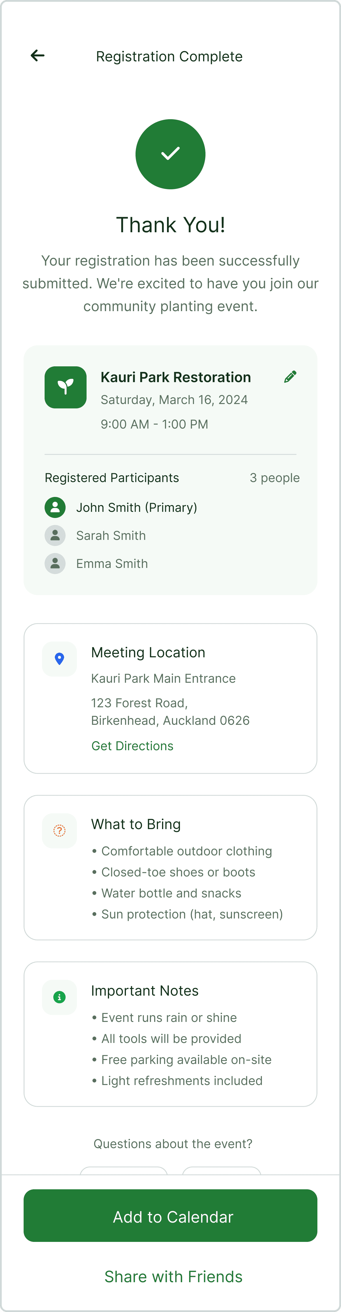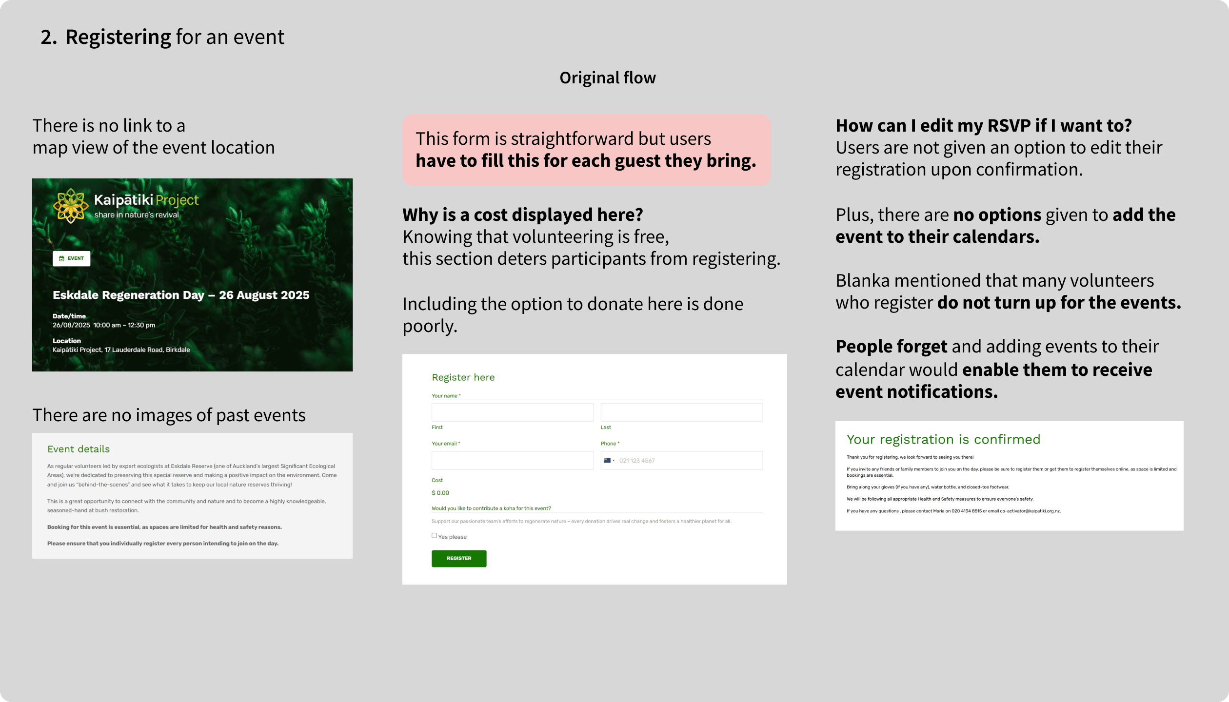 As the current process did not offer a way for volunteers to edit their registration, they would need to email Kaipātiki Project in order to change or cancel their booking, costing further time and effort.