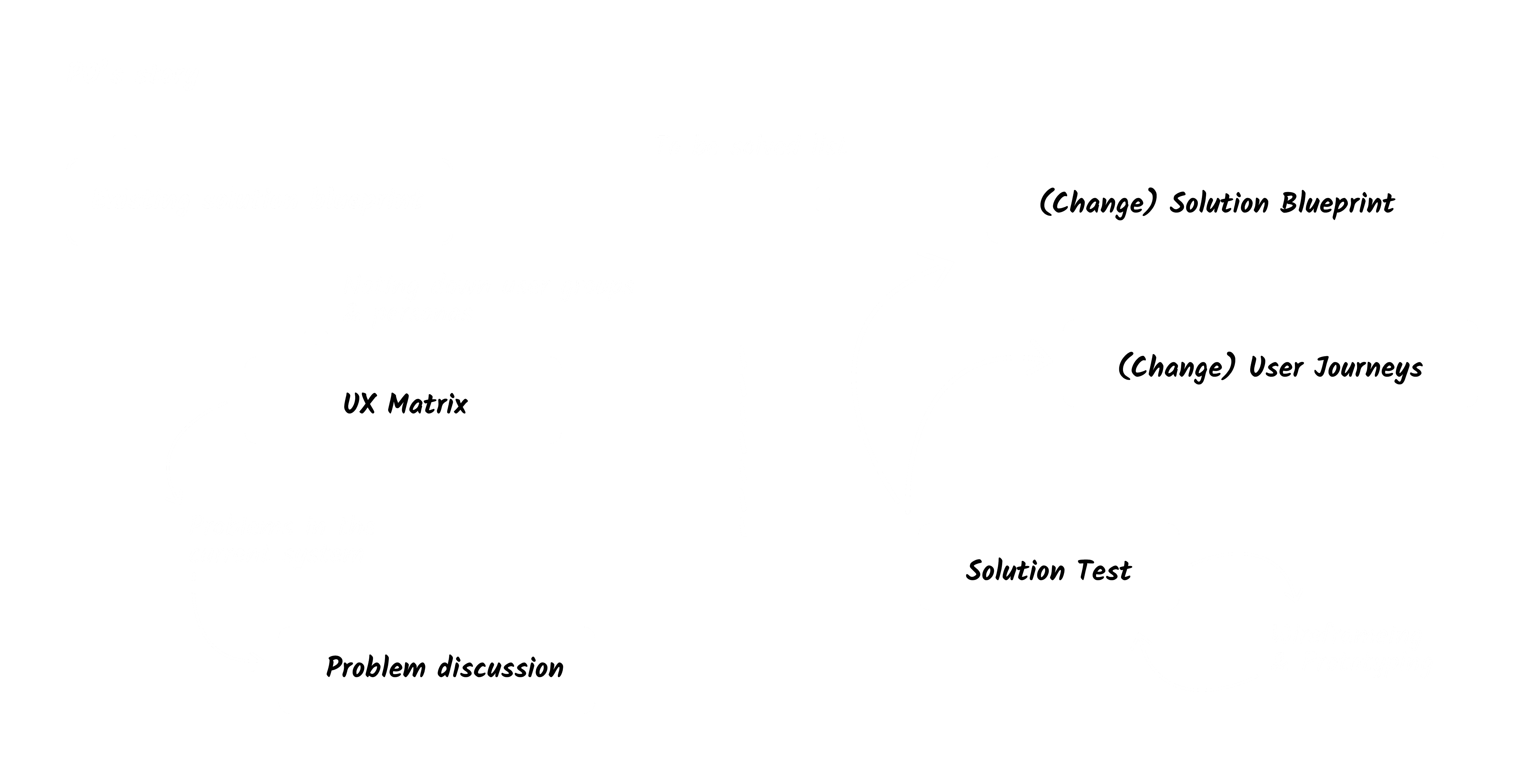 After listening to the POs story and gathering relevant notes about the user groups and their key user journeys, I began creating the existing solution blueprint before creating user personas.